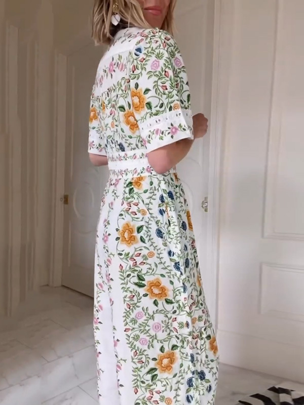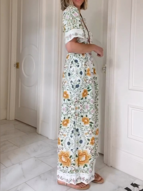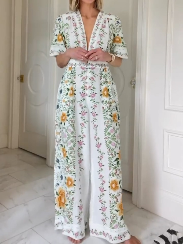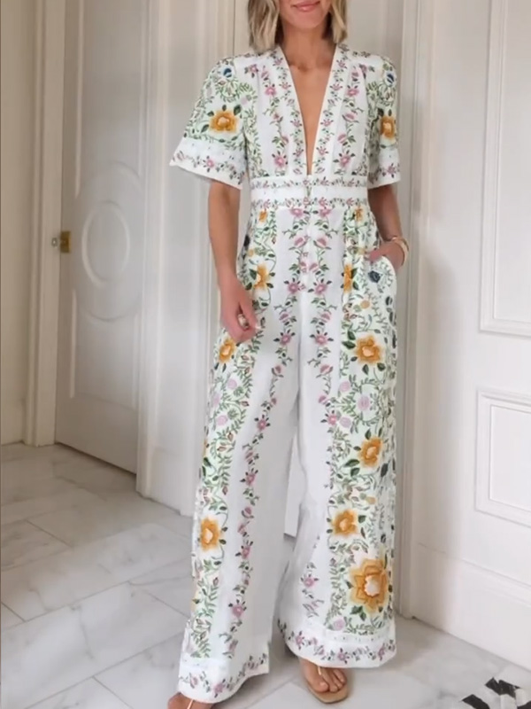 Timeless Elegance: V Neck Floral Elastic Waist Jumpsuit