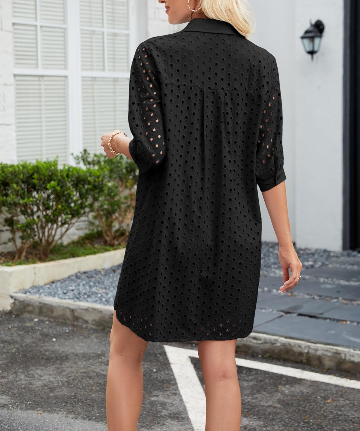 Womens Summer Shirt Dress Eyelet Hollow Out Short Dress with 3/4 Sleeves Button Down Casual Dress Summer Beach Dress